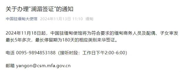 2024年11月18日起,中國駐緬甸使館將為符合要求的緬甸商務人員及配偶、子女審發最長5年多次,最長停留期為180天的相應類別來華簽證。