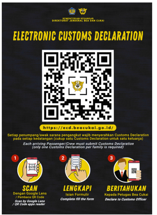 印尼入境時(shí),須填寫ECD電子海關(guān)申報(bào)單:https://ecd.beacukai.go.id/ (出行前一晚行李準(zhǔn)備完畢后,可提前申請(qǐng)截圖保存)