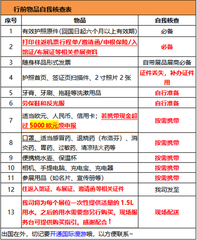 ?、?打印版:往返機(jī)票行程單、申根保險(xiǎn)、入館證 / 布展證(丟失需補(bǔ)購€53 / 人)、邀請(qǐng)函、隨身樣品形式發(fā)票(帶樣品展商必備)