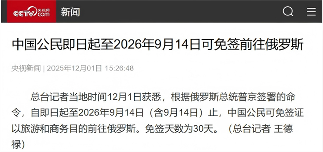 俄羅斯方面實現雙向免簽升級,自2025年9月15日起中方對俄持普通護照人員試行免簽,俄方亦于2025年12月1日起對華免簽,有效期均至2026年9月14日,兩國公民可免簽停留30天開展商務洽談等活動,為雙邊經貿交流掃清障礙。